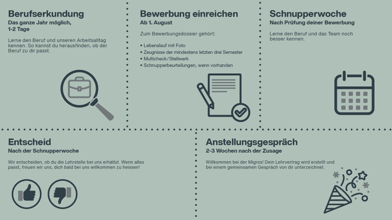 Kandidaten werden durch die Stiftung vorgeschlagen und absolvieren bei Interesse eine Schnupperwoche. Der Vertrag wird zwischen der Stiftung und dem/der Lernenden abgeschlossen, wobei die Migros Ostschweiz als Partnerbetrieb fungiert.