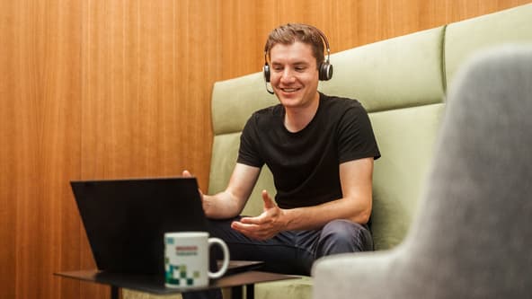 Eigene Hardware, moderne Ausstattung der Büros, höhenverstellbare Tische, Doppelbildschirm.